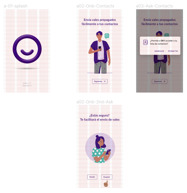 Since many changes and added features were to come in this iteration, I began by doing some simple black-and-white designs, using a Figma community wireframing kit. To start off, I worked on the onboarding process flow and moved on to the landing page for first-time users. My design was to have a screen for all three permission requests (contacts, notification, and location) composed of an illustration, an upper text indicating the permission, and a lower text stating the reason behind the request. All of these would follow up with the OS modal. After testing, I realized that most of the users would not read the amount of text on each screen. For this reason, I called in the other designer on the team to help me out and we came up with a solution for this problem.