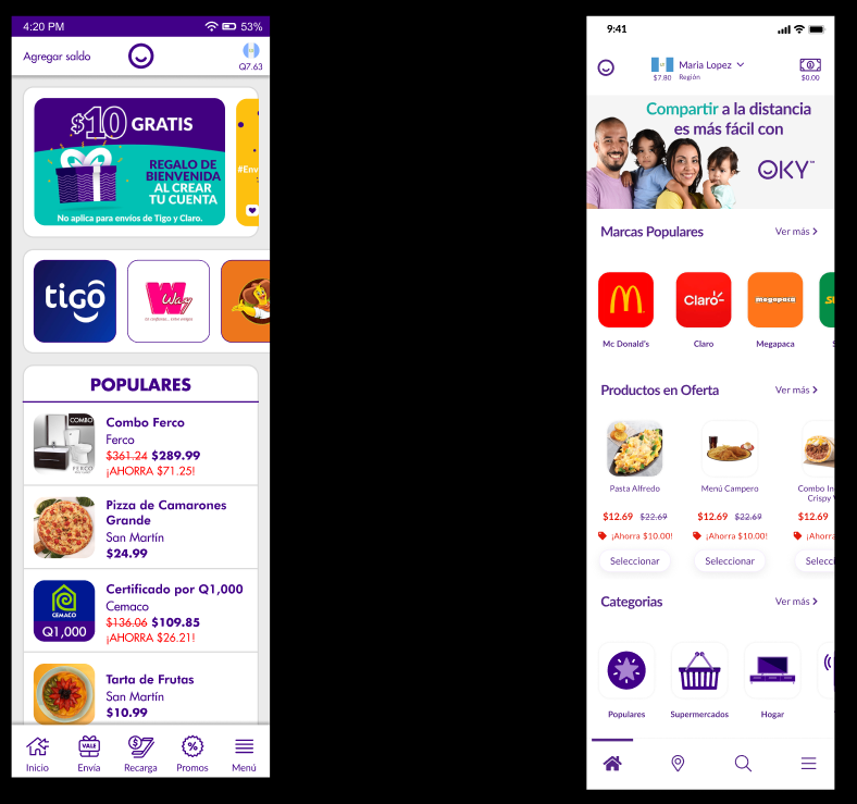The idea behind the design was to have a shopping cart and categorized carousels, for users to add several products and make a checkout. In addition to this, we added promo strips to show special offers and important information. Although this layout was proving to be on point, we came to realize a bigger problem. Since the app is a marketplace for central American brands, the homepage had to be tailored to the country and region of the users' preferences. The two options I proposed were to either integrate that ask in the onboarding process or in the homepage itself.